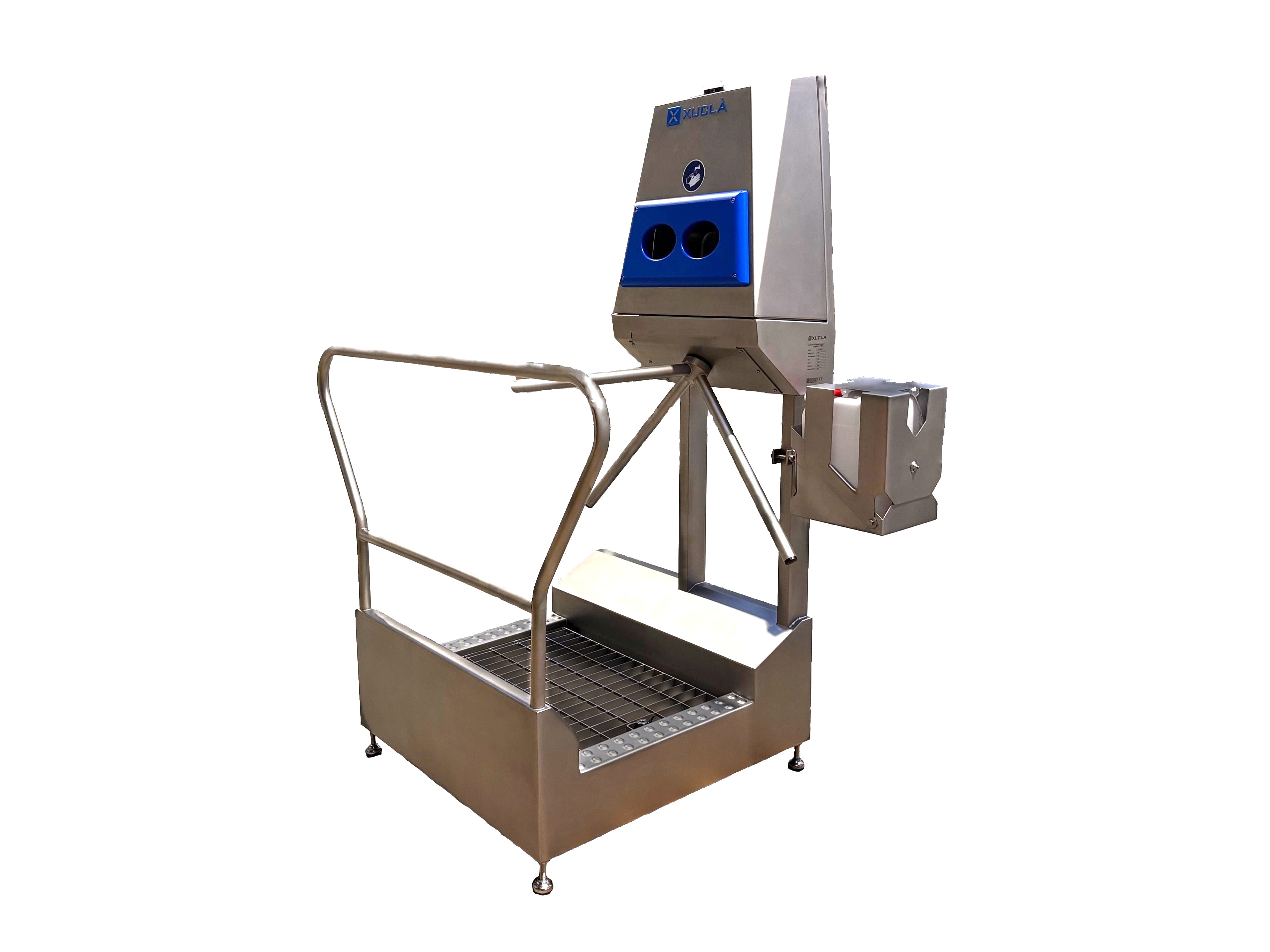Al introducir ambas manos se produce un rociado temporizado de líquido esterilizante y seguidamente permite el paso a través de la barrera del vado sanitario.