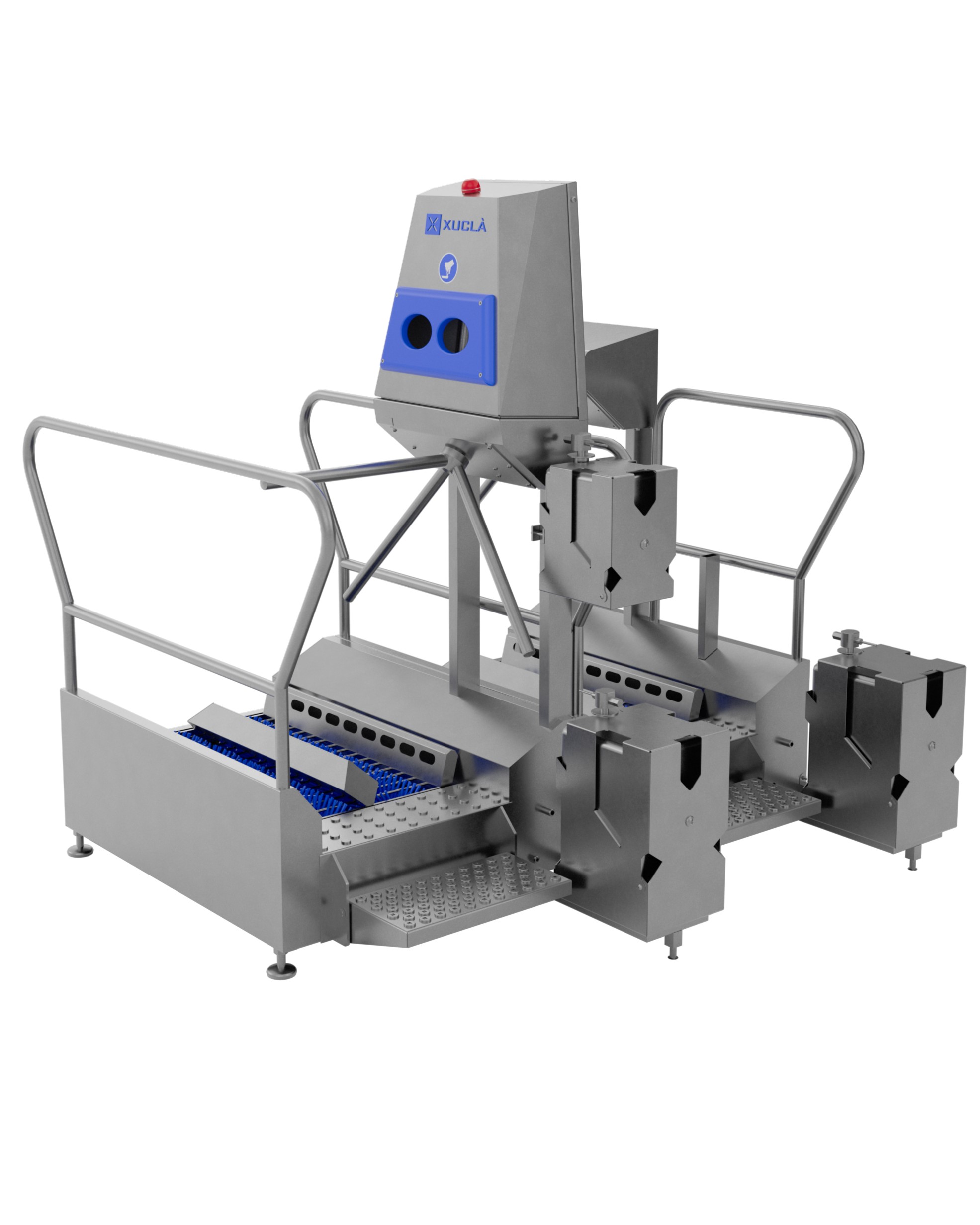 A la sortie, en introduisant ses mains dans la zone prévue à cet effet, l’opérateur déclenche une pulvérisation de liquide stérilisant et autorise son passage par le tourniquet.